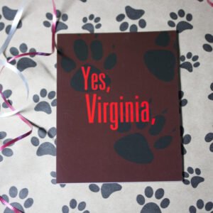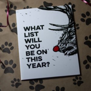 This funny Christmas card depicts a couple large dogs waiting, hoping for something to fall out the Christmas tree.